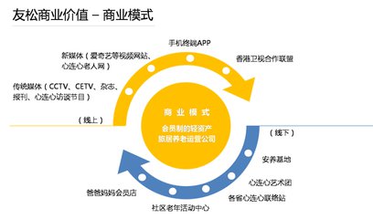 围绕旅居养老,友松国际不仅打造了四大养老基地、心连心艺术团、《心连心》访谈节目,还定期出版《心连心老人报》,开设了针对老年电商市场的爸爸妈妈店,2016年初随着安养联盟APP的正式上线,友松国际形成了完整的线上线下养老产业链。